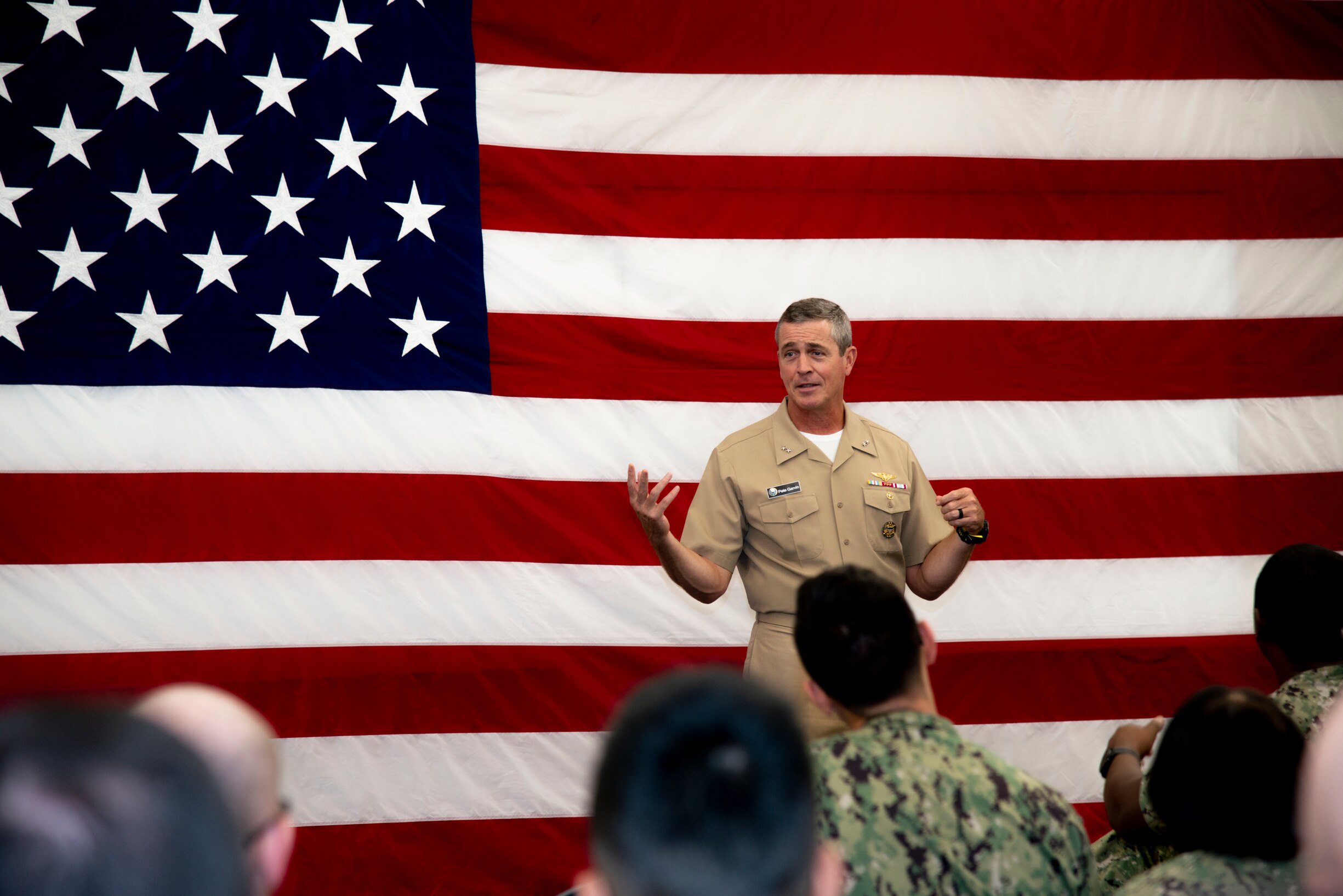 NEWPORT, R.I. (Aug. 31, 2022) Rear Adm. Pete Garvin, commander, Naval Education and Training Command speaks with students from Navy Supply Corps School (NSCS), on Naval Station (NAVSTA) Newport, Aug. 31, 2022. Garvin visited NAVSTA Newport Aug. 31-Sept. 1 to engage with the staff and students of Center for Service Support, Surface Warfare Schools Command, Senior Enlisted Academy, Officer Training Command Newport, Naval Chaplaincy School, Naval Leadership and Ethics Center, and NSCS. (U.S. Navy photo by Mass Communication Specialist 2nd Class Derien C. Luce)