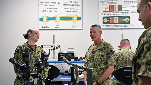 Rear Adm. Pete Garvin, center, commander, Naval Education and Training Command (NETC), speaks with Sailors assigned to Surface Combat Systems Training Command Middle Pacific detachment, at Joint Base Pearl Harbor-Hickam, Hawaii, as part of a visit to Hawaii area NETC commands, Dec. 15, 2022. NETC's mission is to recruit, train and deliver those who serve our nation, taking them from street-to-fleet by transforming civilians into highly skilled, operational and combat ready warfighters. (U.S. Navy photo by Joanne Tumacder)