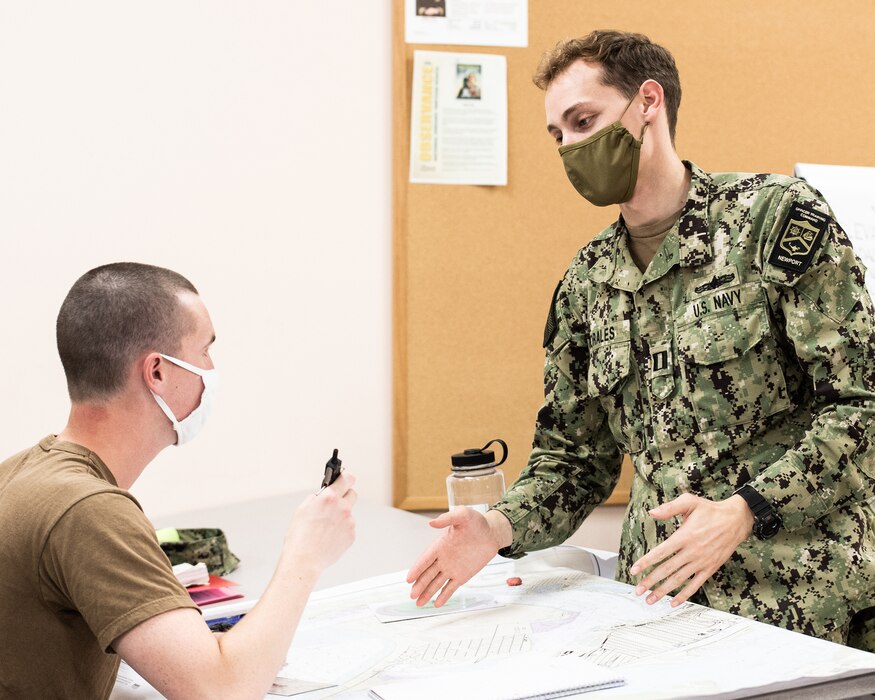 POINT MUGU, Calif. - 200819-N-GF511-0008 POINT MUGU, Calif. (Aug. 19, 2020) -- Civil Engineer Corps Officers School (CECOS) Basic Qualification Course student Ensign Cordell Langley surveys an area for a potential alternative supply route and bridge during a five-day field training exercise (FTX). As an integral part of the school's training cycle, the FTX challenges future Civil Engineer Corps officers to operate as a team during scenario missions in the field. Students learn basic principles and skill sets, such as leadership, teamwork, and accountability, to help them be successful leading Seabees in naval construction force expeditionary units. (U.S. Navy photo by Amber Vaglica)